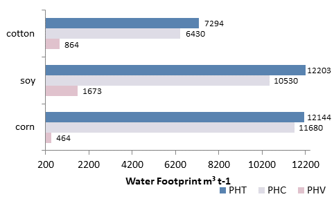 The Green Water Footprint calculation of basin planted crops (cotton, corn and soybean) was carried out from Equation 1 and involves the Crop Green Water (cgreen) consumption and the crop productivity in the studied region.