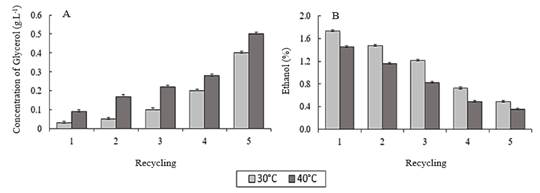 The yeast grown on saccharine sorghum broth at the temperature of 30 °C showed similar glycerol accumulation along recycling to that observed on sugarcane broth. However, this accumulation was lower at both temperatures, 0.24 g L-1 at 30 °C and 0.37 g L-1 at 40 °C (Figure 4A). A decline in ethanol concentration was also observed on this substrate along recycling at the temperatures studied (Figure 4B).