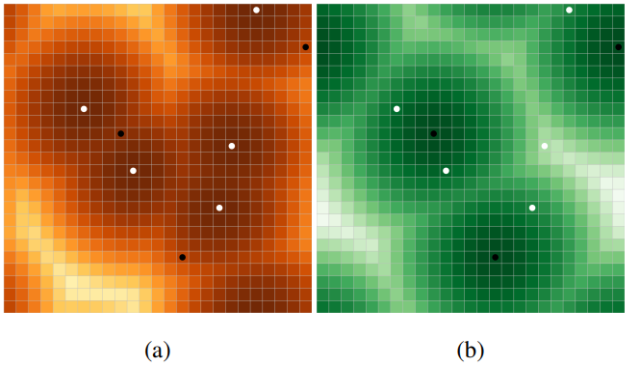 Figura 2 - Campo CH gerado por 5 presas (pontos brancos) em (a) e CP produzidos por 3 predadores (pontos pretos) em (b). Em ambos os casos eles foram obtidos através da equação (1), sendo que os locais mais escuros e mais claros representam os maiores e menores valores dos campos, respectivamente