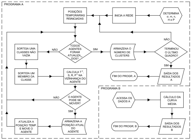 Desta maneira, podemos utilizar os procedimentos anteriores para produzir resultados suficientes para realizar um tratamento estatístico, e completar o ciclo através do último loop. Isto consiste em determinamos o número médio de clusters em cada quadro, acompanhados das medidas de dispersão, os quais nos limitaremos ao desvio padrão neste trabalho. Ou seja, a saída desta etapa é um arquivo com o número médio de clusters para cada quadro. A figura 3 na sequência, ilustra todo o algorítimo com mais detalhes.