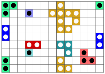 Figura 4 - Clusters de diversos tamanhos formados por predadores e presas, representados por círculos pretos e brancos respectivamente. Nesta imagem, as cores diferenciadas nas células representam seus clusters.