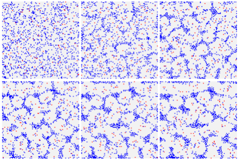 Figura 5 - Evolução temporal a partir do início da simulação, para uma rede 100 × 100, a cada 4 quadros com σ = 1:5. O espaço foi populado com [H] = 12:0% de presas em azul e [P] = 1:0% de predadores em vermelho