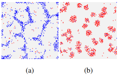 Figura 6 - Redes de dimensões 100 × 100, utilizando σ = 1:5 e evoluída para 30 quadros. Em (a) ela é composta por [P] = 0; 5% de predadores em vermelho e [H] = 10; 0% de presas em azul. Já em (b) a rede é populada por [P] = 10; 0% de predadores e [H] = 0; 5% de presas