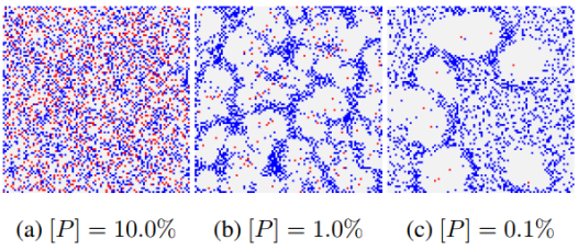 Figura 7 - Diferentes simulações de concentrações de predadores [P] em vermelho, para uma rede 100 × 100, evoluída a 30 quadros. A concentração de presas inseridas é [H] = 20:0% em azul, para σ = 1:5.