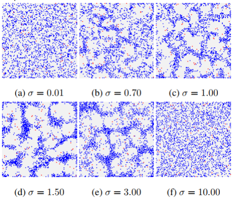 Quando as concentrações [H] e [P] são mantidas fixas, porém é variado o valor de σ, observamos que nos extremos de um intervalo de σ = (0; 10], as presas passam a não se agrupar (ver figuras 8a e 8 f). Entretanto, para valores intermediários, notamos a formação de grupos que parecem mais compactos quando σ = 1:5 (ver figura 8d). Já para σ ≈ 0, os agentes produzem campos em forma de picos. Ou seja, eles são intensos nas suas origens e praticamente nulos em suas vizinhanças. Porém, quando σ é suficientemente grande, aqui representado por σ = 10:0, também não se unem porque os agentes produzem campos homogêneos. Isto implica na probabilidade equilibrada deles se movimentarem para qualquer sentido, executando movimentos brownianos.