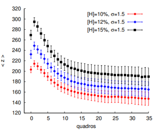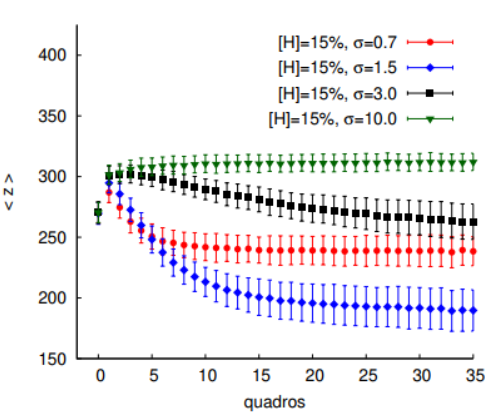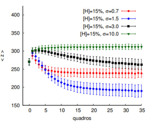 De acordo com as figuras 9 e 10, entendemos que após uma pequena instabilidade, os números médios de clusters (< z >) diminuíram. Como o número de agentes é sempre constante, então isto significa que houve no início uma grande quantidade de pequenos clusters que se fundiram. O mesmo efeito é observado na maioria dos casos, quando a concentração de H é a mesma para vários ensaios com diferentes valores de σ (ver figura 11).