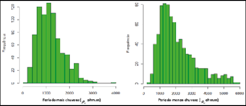 A maior variação de resistividade elétrica aparente foi observada no período menos chuvoso. Valores de média e mediana próximos um do outro indicam distribuições com pouca assimetria. Neste caso, a distribuição do período mais chuvoso apresentou-se mais simétrico em relação ao período menos chuvoso. A média representa melhor distribuições simétricas, por isso quanto mais simétrica é a distribuição mais precisas serão as estimativas, uma vez que os métodos de interpolação são, em geral, baseados na média (QUEIROZ, 2003).