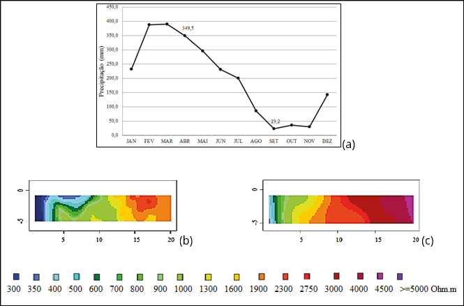 Figura 5 – Média da precipitação mensal (2003-2015) na área de estudo (a); e mapas da krigagem universal para resistividade elétrica aparente do perfil (profundidade em metros) na época chuvosa (b) e na época menos chuvosa (c)