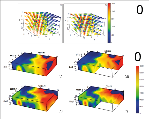 – Mapeamento: com os resultados da interpolação ou simulação é possível visualizá-los utilizando mapas iterativos em três dimensões ou várias imagens planas discretizadas em um dos eixos, denominados de slices. Estas funcionalidades estão incorporadas nos pacotes rgl e lattice, implantados no ambiente R, respectivamente.