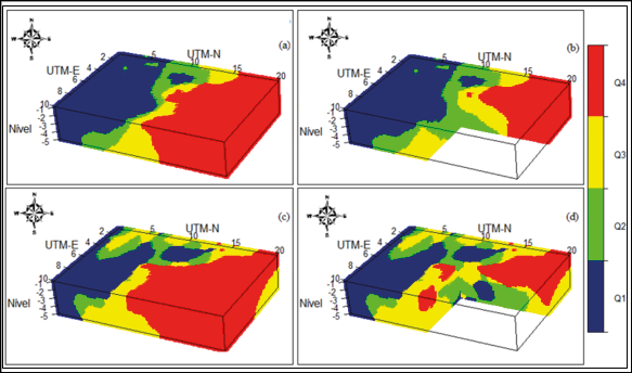 Para realização de estimativas de volumes em regiões com diversos níveis de resistividade elétrica aparente foi considerada a técnica da krigagem indicativa (Figura 7). Neste caso, foram definidos os quartis para as resistividade em cada período e foram utilizadas variáveis indicadoras para cada quartil. A distribuição foi dividida em 4 partes iguais (os quartis) com 25% dos valores medidos de resistividade elétrica aparente em cada quartil. Os 25% dos valores de eletrorresistividade do quartil 1 estavam na faixa de 394 a 1252.75 omh.m. Para os quartis 2, 3 e 4 as variações de resistividade elétrica aparente foram de 1252.75 a 1770.5, 1770.5 a 2635 e 2635 a 5863 ohm.m, respectivamente.