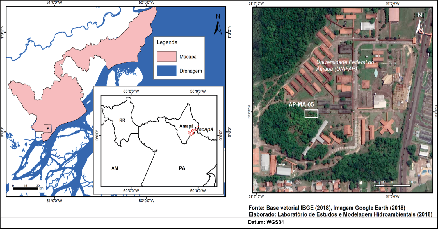 A área de estudo está localizada no sítio arqueológico AP-MA-05 (00° 01’S 51°05’W), no bairro Universitário, na região sul da cidade de Macapá (AP), no terreno ocupado pela Universidade Federal do Amapá (UNIFAP), abrangendo cerca de 200 m² (Figura 1).