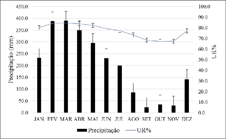 A Figura 2 apresenta a média mensal da precipitação de Macapá, de 2003 a 2015 (13 anos), demonstrando as duas estações distintas, uma chuvosa, predominantemente de dezembro a julho, com média acima de 270 mm, e a estação menos chuvosa, de agosto a novembro, com média inferior a 44 mm. Setembro, outubro e novembro evidenciam os três meses mais secos, com média apenas de 29,4 mm. Na estação mais chuvosas a umidade relativa média mensal é de 80,6% e na menos chuvosa de 69%, onde Tavares (2014) afirma que nos meses mais secos ocorre um déficit de umidade no solo.
