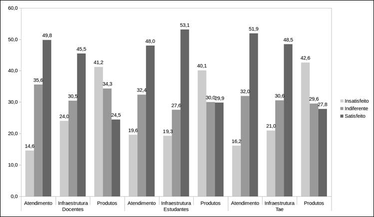A Figura 7 apresenta o grau de satisfação dos clientes por tipo de vínculo com a UFSM. Nota-se que todas as categorias estão satisfeitas com o atendimento e a infraestruturas dos estabelecimentos. No entanto, em relação ao fator produtos, todas as categorias se mostram insatisfeitas. A categoria dos TAE's possui um nível de insatisfação maior (42,6%) sobre o fator produtos em relação às outras duas categorias.