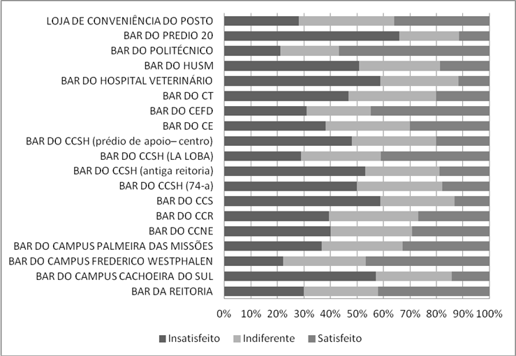 Independentemente de serem os bares, lancherias e restaurantes contratos licitatórios, a comunidade acadêmica visualiza todos os estabelecimentos como “bares da UFSM”, ou seja, é a imagem da instituição que está atrelada à satisfação ou insatisfação dos usuários. Neste sentido, é indispensável que a instituição além de avaliar periodicamente o grau de satisfação dos usuários, promova aprimoramentos contínuos nos processos licitatórios, visando garantir que os licitados ofereçam serviços de qualidade.