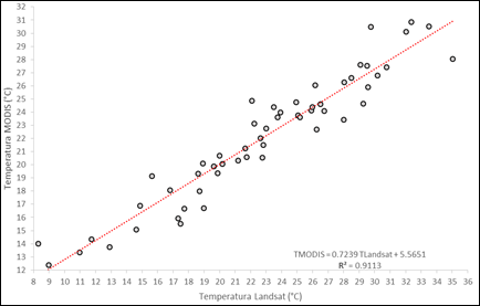 O fator REQM, o coeficiente de determinação R2 e a equação de regressão foram determinados com os dados Landsat e MODIS da série de temperatura superficial no período de 2001-2017. A equação resultante permite ajustar os valores da temperatura superficial das imagens Landsat para o período de 1985 até 2000. Os valores utilizados para tal pareamento foram selecionados na mesma data e organizados ascendentemente. Com a série temporal de 32 anos (1985 até 2017), foram construídas séries mensais de temperatura superficial da lagoa e desenvolvida a análise de sensibilidade e a construção dos gráficos.
