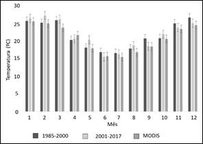 Para os meses de junho e julho que são meses de inverno, se registram temperaturas mais frias no período 2001-2017, o qual pode estar relacionado a eventos climáticos mais extremos devido às mudanças climáticas, como é o caso das frentes frias (MUNAR et al., 2018) que agem nesta região e conforme sugerido por Kenawy et al. (2019). Para a estação de transição de primavera e começos de verão não é claro o comportamento do regime das temperaturas, pois diversos fatores climáticos estão envolvidos, tais como pressão atmosférica e direção e intensidade do vento (KENAWY et al., 2019).