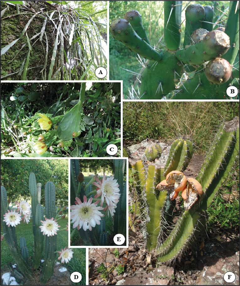Figure 3 – A. Lepismium warmingianum. B. Opuntia elata. C. Opuntia monacantha. D-F. Cereus hildimannianus