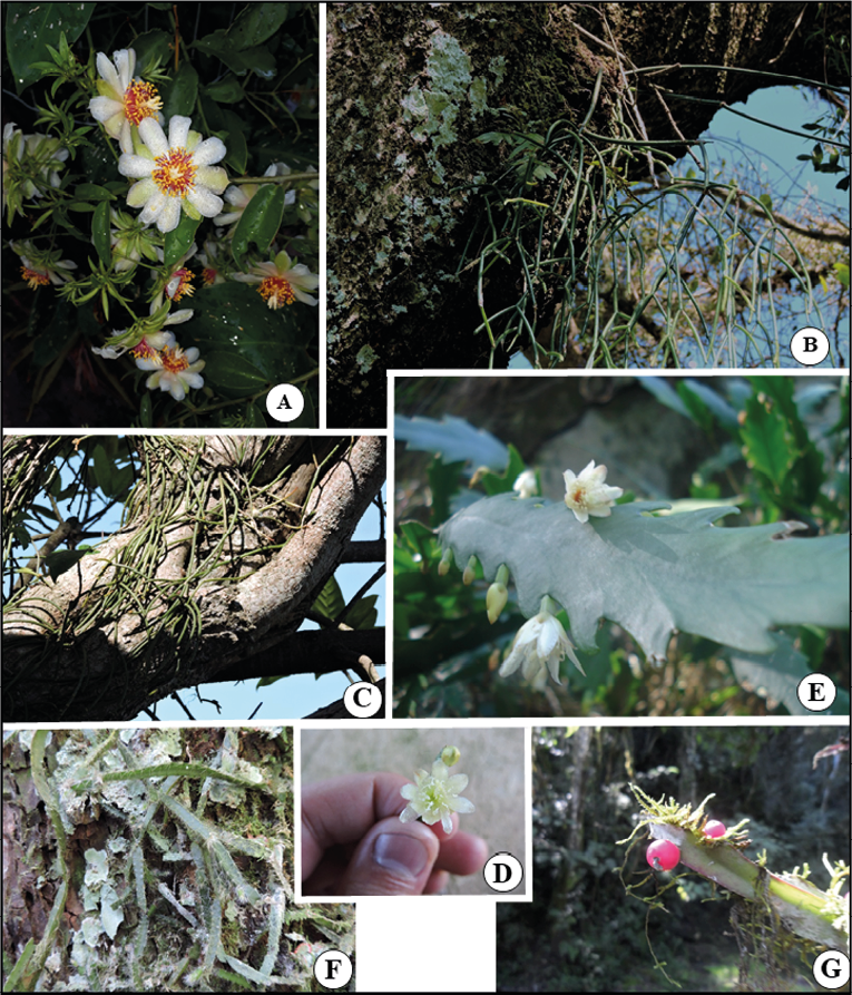 Figure 4 – A. Pereskia aculeata. B. Rhipsalis teres. C-D. Lepismium lumbricoides. E. Lepismium houlletianum. F-G. Lepismium cruciforme