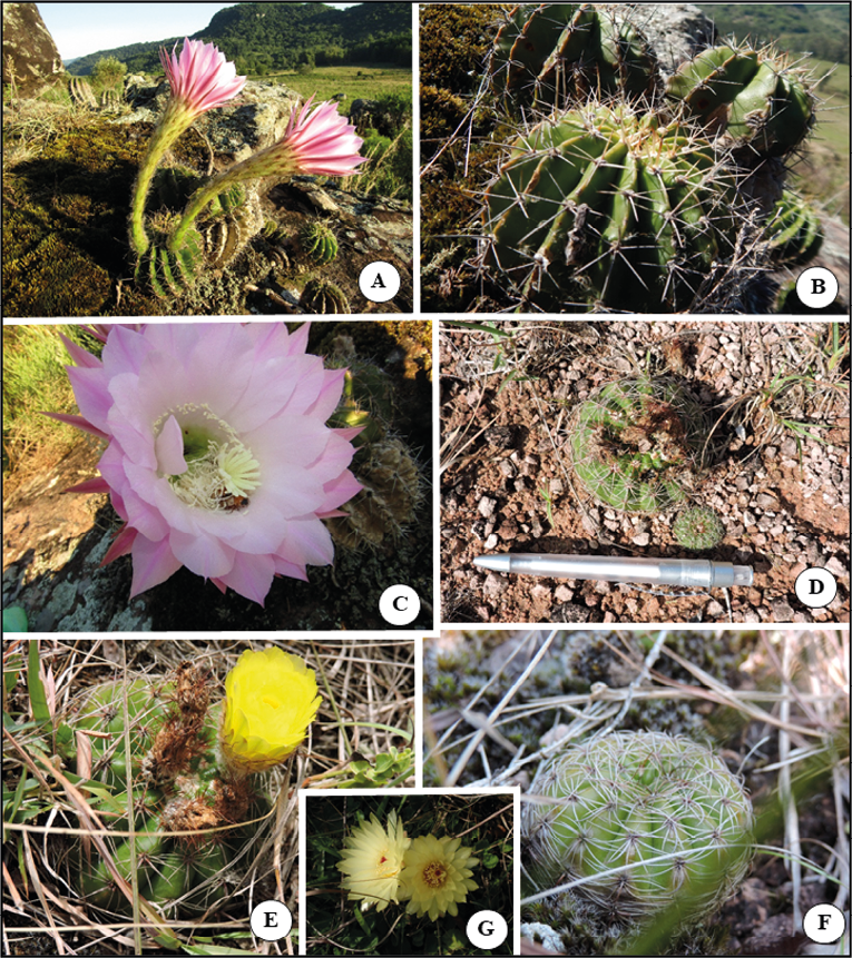 Even though Echinopsis oxygona (Figure 5. A-C) conservation status, according to Goetsch et al. (2015) is LC in a world-wide context, in Rio Grande do Sul, this species is Vulnerable (VU). Several species of the genus Parodia were also found. Parodia glaucina, according to SEMA-RS (2014), is currently in Endangered (EN) conservation status; P. horstii is in EN conservation status; P. linkii, according Goettsch et al. (2015) is LC in a world-wide context, while for Rio Grande do Sul, it is VU. Parodia ottonis (Figure 5. F-G) is considered VU. All the threatened species were found on rocky areas such as rocky cliffs and the nearby rocky sites, usually surrounded by significant grasslands.
