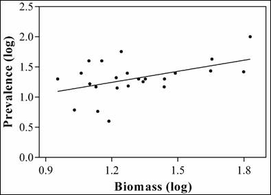 Fig. 1 -Scatter plot that demonstrates the positive correlation between hemosporid prevalence and the average biomass of the avian species