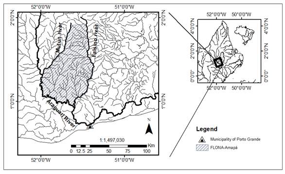 The study was carried out within and outside the Sustainable Use and Conservation Unit (UCs), National Forest of Amapá-FLONA-AP (North between the coordinates 51º30’25”W and 1º51’42”N, and South between 51º35’41”W and 0º55’27”N) (BÁRBARA, 2006; ICMBIO, 2011; IEF/SEMA, 2014) which is bathed by the Araguari River (High and Medium). The Araguari River basin is the largest and most important basin of the Amapá state, born in the Serra do Tumucumaque and has 617 km of extension to its mouth, in the Atlantic Ocean (CUNHA et al., 2004). Conceptually, it is divided into High (132 km), Medium (161 km) and Low Araguari River (205 km) (CUNHA, 2009). The FLONA-AP has a territorial area of 4,120 km² and FLOTA-AP has a larger area, approximately 23,000 km². However, for this study, only one section corresponding to the limits of the Medium Araguari River (Figure 1) was selected.