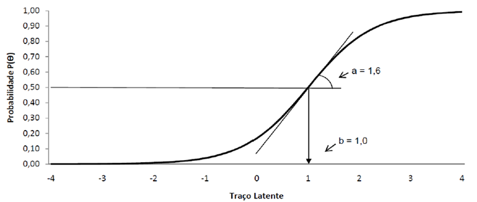 Pode-se observar que a curva característica do item neste modelo é uma função não linear e, onde maior a habilidade, maior a probabilidade de responder o item corretamente. Observa-se que, o indivíduo que tem traço latente igual a um, possui 0,5 de probabilidade de concordar ou estar satisfeito com esse item. Indivíduos com traço latente maior que 1, possuem mais de 0,5 de probabilidade de concordar ou estar satisfeito com esse item, enquanto que indivíduos com traço latente menor que 1, possuem probabilidade menor de 0,5 de concordar ou estar satisfeito com esse item.