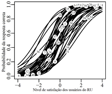 Os dados foram analisados por meio de estatísticas descritivas, tabelas de frequências, análise fatorial e Teoria da Resposta ao Item. Participaram da pesquisa 1.855 usuários do RU da UFSM. O resultado da análise fatorial mostrou que existe um fator dominante, denominado nível de satisfação do usuário do RU, o que indica que a escolha do ML2 da TRI é uma plausível para modelagem desses dados. No processo de calibração dos itens os resultados se mostraram coerentes, tanto para o parâmetro de dificuldade quanto para o de discriminação, os mesmos corroboram com a análise descritiva. Os itens “guisado de soja”, “Banheiro”, “Barulhos” e “Tamanho da fila para entrar no RU”, foram identificados como os itens mais difíceis de obter satisfação. Enquanto que os itens “preço cobrado”, “Iluminação” e “Localização” foram identificados como os mais fáceis de se obter satisfação. Já os itens “Qualidade dos alimentos” e “Complemento” foram identificados como os itens que melhor discriminam entre os usuários satisfeitos e insatisfeitos, enquanto que os itens “Ventilação” e “Opções de pagamento” são os que menos discriminam. De uma maneira geral, os indivíduos estão mais satisfeitos do que não satisfeitos, pois há 25 itens com bi negativo e 16 itens com bi positivo. A FIT indicou que o instrumento de medida tem uma boa quantidade de informação, com valores entre -4 e 3. Mostrou-se bastante adequado para medir a satisfação de indivíduos que possuem nível de satisfação entre -3 e 2, que corresponde a uma boa cobertura do traço latente. Ainda, foi possível identificar em que nível da escala de satisfação os usuários do RU da UFSM estão situados, assim como a interpretação dos níveis. Pode-se concluir que o ML2 da TRI foi adequado para a análise proposta.