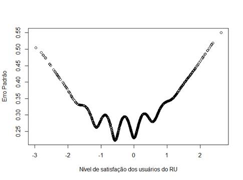 Diferentemente do caso da avaliação educacional, onde a escala é construída para ser utilizada por um bom período de tempo se beneficiando da propriedade da invariância dos parâmetros dos itens (BAKER, 2001), na avaliação da satisfação, essa propriedade pode não funcionar adequadamente. Por exemplo, se os administradores do RU efetivassem alguma ação que reduzisse o tamanho da fila para entrar no RU, identificado como um dos itens mais difíceis de obter satisfação do usuário do RU, uma nova pesquisa poderia apontar que esse item passaria a ser mais satisfatório do que foi registrado nessa pesquisa, ou seja, haveria uma mudança nos parâmetros dos itens. Nesse sentido, se alguma ação for tomada para mudar o nível de satisfação dos itens avaliados, uma nova pesquisa deverá ser realizada, pois alguns itens podem sofrer mudanças nas suas propriedades psicométricas, ao longo do tempo, devendo ter as suas estimativas atualizadas.