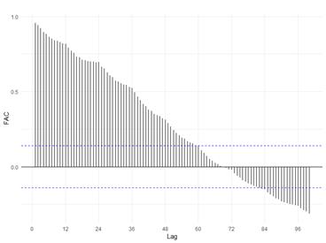 Para realizar a previsão utiliza-se métodos quantitativos que se baseiam em dados históricos para detectar padrõese então, prever os futuros valores das séries temporais, tais métodos empregam ferramentas matemático-estatístico. A análise de uma série temporal é composta por um conjunto de procedimentos de análise e tratamento dos dados, objetivando gerar estimativas futuras com maior precisão (ARAÚJO, 2018). Durante a análise da série temporal do Faturamento da Indústria Alimentícia Brasileira, foi constatado que a série temporal apresenta sazonalidade, e também foram aplicados testes de raiz unitária, para verificar tendência estocástica, e de Wald-Wolfowitz, para verificar tendência determinística.