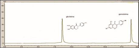 Figure 1 – Chromatographic profiles by HPLC standard for aglycones (Sigma- Aldrich) by high-performance liquid chromatography (HPLC) for genistein and glycitein, at retention times of 9.2 minutes and 18.7 minutes respectively