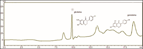 Figure 2 – Chromatographic profiles by HPLC standard for the compounds obtained by combining soybean germ extract with glycitein and genistein at retention times of 9.60 minutes and 18.50 minutes respectively. The isoflavones were extracted from 20 g/L soy germ by treating it with 70% ethanol for two hours