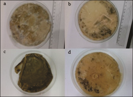 Figure 4 shows the biofilms obtained with kefir grains (20 gl-1) with brown sugar (40 gl-1) with different concentrations of soy germ (a) 20 gl-1, b) 40 gl-1, c) 80 gl-1and d) 100 gl-1).