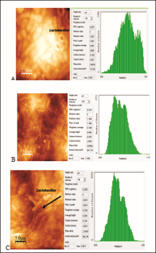 Figure 5 – Graphic image obtained by atomic force microscopy (AFM) showing: A), the roughness (0.287 mM) of kefir biofilm formed by 2 g/L soy germ. Note the presence of Lactobacillus. B) Biofilm with soy germ (10g/L) with roughness (0. 283 µm.). C) Biofilm with soy germ (80g/L) with RMS roughness: 0.167 µM. Increasing of soy germ concentration did not alter the roughness significantly