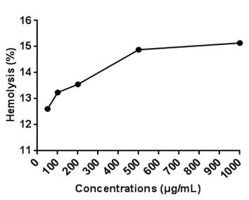 The hemolytic activity of the AZEO was investigated in vitro in human erythrocytes. The hemolytic percentage 12.61%, 13.24%, 13.55%, 14.88% and 15.14% were obtained for a dose of 50µg/mL, 100µg/mL, 200µg/mL, 500µg/mL and 1000µg/mL, respectively (Figure 2).