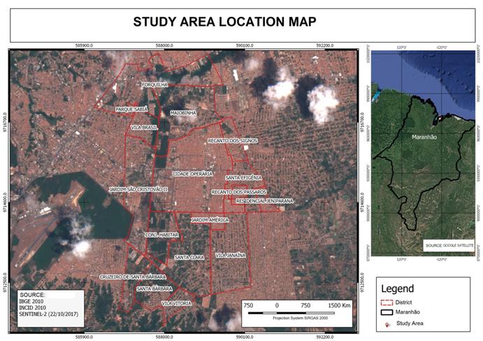 The Cidade Operária is a neighborhood located in the central-eastern portion of the city of São Luiz and the central portion of the large island of Maranhão, and that, along with its neighboring districts has an area of approximately 23.82 km (Figure 1). The neighborhoods surrounding the Cidade Operária are: Forquilha, Vila Brazil, Jardim São Cristóvão, Maiobinha, Recanto dos Signos, Recanto dos Pássaros, Residencial Jeniparana, Conjunto Habitar, Santa Clara, Vila Janaína, Santa Bárbara, Villa Vitória and Cruzeiro de Santa Bárbara. The occupation of this portion of the island has its origin in 1986, with the rise of housing Cidade Operária, managed by COHAB[1] for buyers of up to five minimum wages. The town also suffered from spontaneous occupations over her bangs, which, in turn, gave the various neighborhoods of its surroundings, as highlighted Silva (2016).