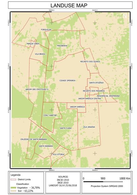 The study area also caused in the 80 intended to be a residential area, consolidated so that today are seen two classes of use and the local soil coverage: Extended altered region (where noted characteristically elements heat seals, inserted along the urban consolidation, such as asphalt pavement, concrete constructions, roofing and other materials) and small plant cover (this, in turn, being proportionally lower than the anthropization class). The increase in population, in this same area, unplanned way, generated the expansion of residential areas surrounding the Cidade Operária neighborhood, as highlighted Silva (2016) incurring changes in the local environment.