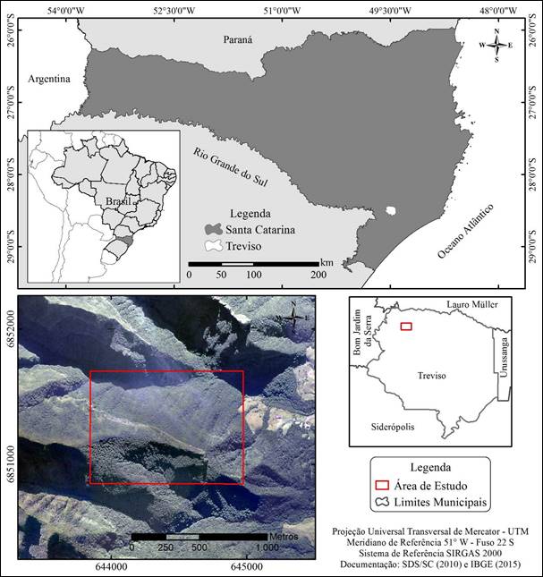 A área de estudo para aferição da forma, tamanho e posição (geometrias) de cicatrizes de escorregamentos possui 94 ha (0,94 km²) e constitui um recorte espacial selecionado por reunir vertentes íngremes com expressivos registros de cicatrizes de escorregamentos para o ano de 1978. Num espectro maior, este quadrante insere-se na nas cabeceiras do rio Mãe Luzia, que é um dos principais rios formadores da Bacia Hidrográfica do Rio Araranguá, Estado de Santa Catarina. O local fica no interior do município de Treviso (Figura 1).