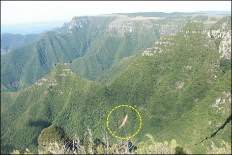 Figura 2 – Aspecto do relevo escarpado na área de estudo e de uma cicatriz de escorregamento recente, no destaque