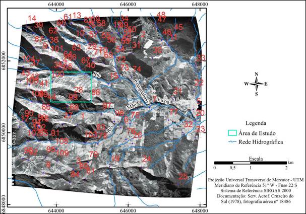 A etapa subsequente, para interpretação de antigas cicatrizes de escorregamentos na área de estudo, consistiu em compor um raster base com as fotografias aéreas antigas. Na associação de diferentes fotografias, a de número 18.486 ficou sobreposta às demais, pelo fato de recobrir grande parte do local (foto principal). Antes da digitalização das feições de escorregamentos fez-se o georreferenciamento deste conjunto de imagens, dispondo-se de 108 pontos de amarração, dentro e nas imediações da área de estudo, como podem ser visualizados aqueles que incidiram sobre a fotografia principal (Figura 4). Organizadas num ambiente SIG, as fotografias, fonte da informação temática de interesse (cicatrizes de escorregamento), foram georreferenciadas em diferentes ordens polinomiais.