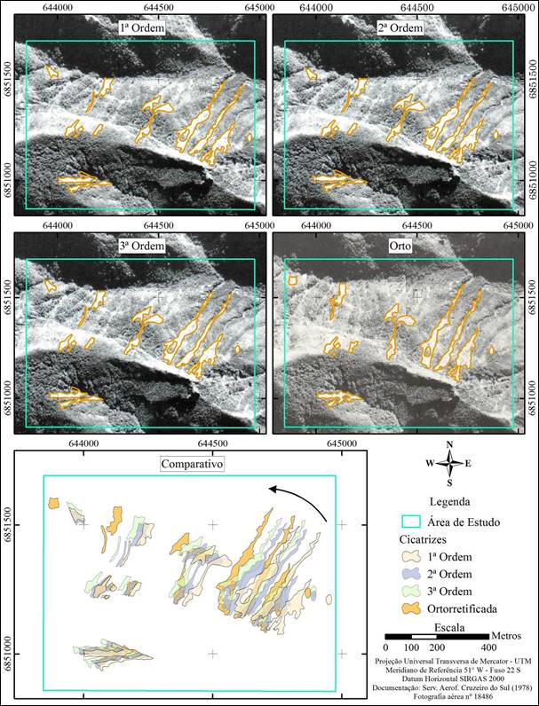 Pela ortorretificação houve correção ortométrica, notadamente no fundo do vale, deixando o eixo maior das cicatrizes alongado, a exemplo das situadas à direita da área de estudo, alinhadas NNE-SSO, e não NE-SO, como nos diferentes ajustes polinomiais executados no georreferenciamento. Maiores detalhes, que comparam a 1ª ordem polinomial (de menor ajuste) com a ortorretificação, são vistos na Figura 6.