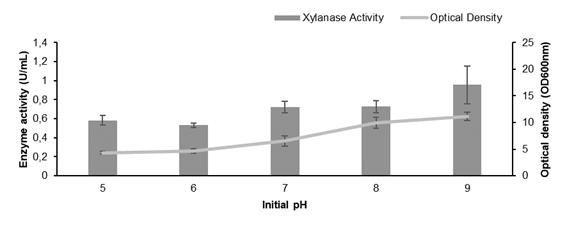 Figure 3 - Effect of initial pH on xylanase production and bacterial growth. Enzyme production was conducted at 35 °C during 48h of incubation, 150 rpm, 2.0% (v/v) inoculum size and 1.0% (w/v) birchwood xylan concentration. Enzyme activity was measured using standard assay. Bacterial growth was measured as described above. The experiments were performed in triplicate and data presented in figure is the average. Error bars are shown for standard deviation