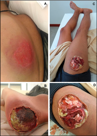 Figure 1 – Figure 2(A) Pressure injury Stage 2: in the dorsal region, next to the left scapula. Figure 2(B) Pressure injury Stage Stage 3: left heel. Figure 2(C) Pressure injury Stage 4: left trochanter. Figure 2(D) Pressure injury Stage 4: left trochanter. Figure 2(C) and 2(D) refer to the same injury in different increments