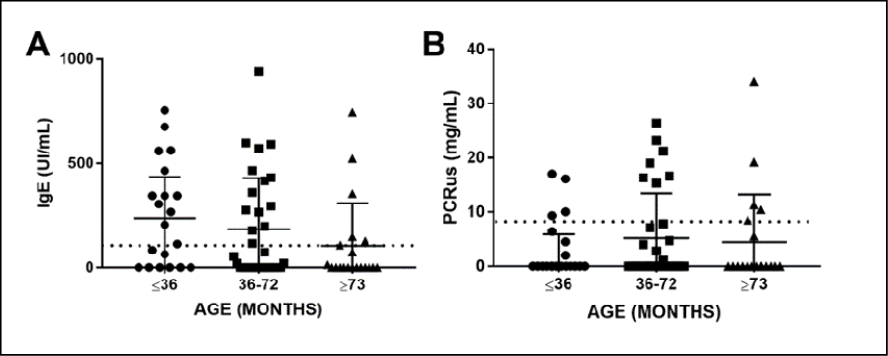 Total immunoglobulin E (IgE) and inflammatory C-reactive protein (PCRus) tests were performed. The patients were divided into three groups according to their age (≤ 36, 37 to 72 and ≥ 73 months). There was no significant difference in IgE and PCR levels among the three groups evaluated (Figure1A e B).