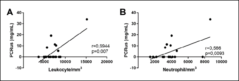 Figure 2 – Spearman correlation (r). Variables PCRus/Leukocytes (A) and PCRus/Neutrophils (B), in patients ≥ 73 months. Statistically significant p < 0.05