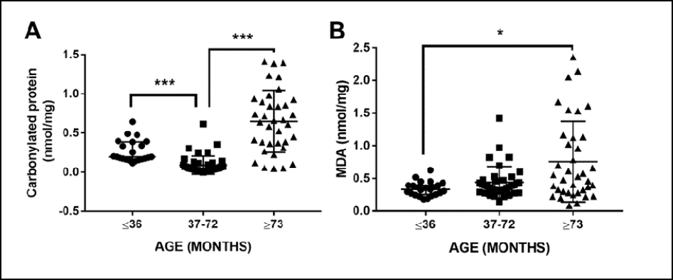 Carbonylated protein and lipid peroxidation analysis were performed to verify tissue damage resulting from oxidative stress (Figure 4). The pre-school group (37 to 72 months) presented significantly lower values of carbonylated proteins compared to the other two groups (Figure 4A). Lipid peroxidation showed significantly higher dosages in the group ≥ 73 months compared to the lactents’ group (Figure 4B). For both markers, the older group presented a larger dispersion.