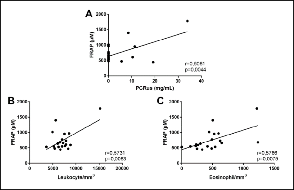 Figure 5 – Spearman scatters plot and correlation (r). Variables FRAP/PCRus (A), FRAP/Total leukocytes (B), and FRAP/Eosinophils (C). Statistically significant p < 0.05