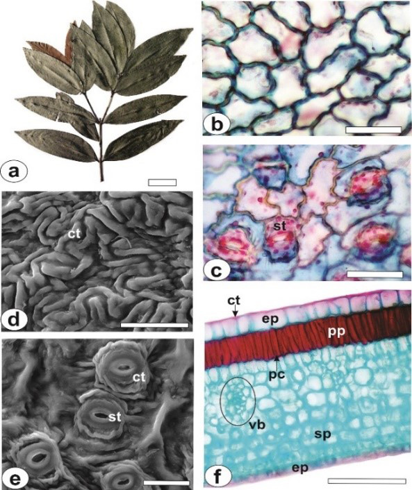 In where: [b, c, and f: light microscopy; d-e: SEM]. (a) A shoot with leaves. (b–e) Leaf epidermis in surface view (b: adaxial side, showing the wavy anticlinal epidermal cell walls; c: abaxial side, hypostomatic leaves; d: adaxial side, evidencing the striated cuticle; e: abaxial side, evidencing the striated cuticle). (f) Transverse sections of the leaf blade. [ct, cuticle; ep, epidermis; pc, phenolic compounds; pp, palisade parenchyma; sp, spongy parenchyma; st, stomata; vb, vascular bundle]. Scale bar: a = 2 cm; f = 50 µm; d, e = 20 µm; b-c = 25 µm.