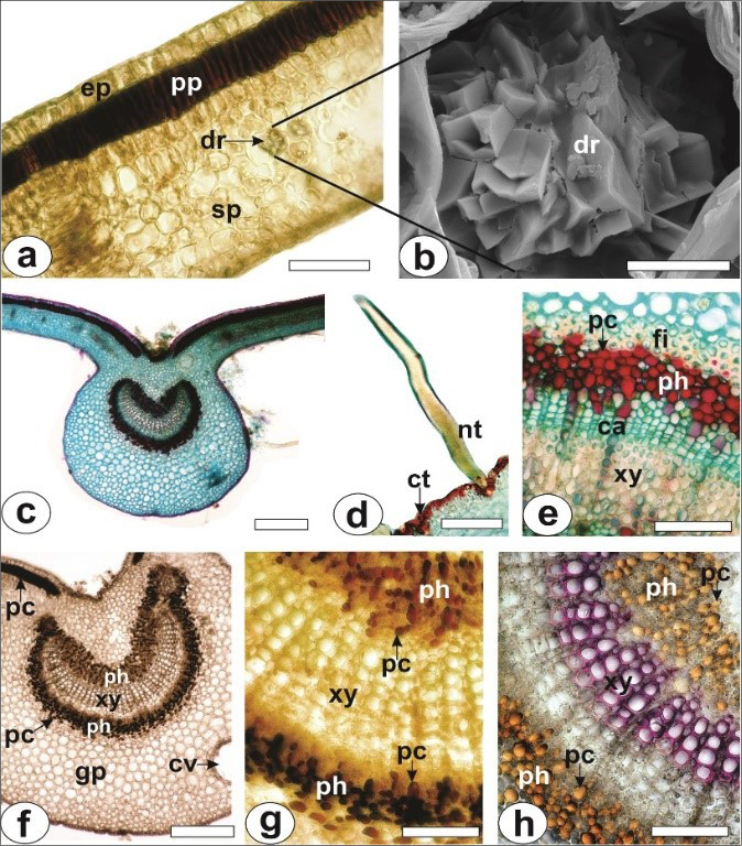 In where: [a, c-h: light microscopy; b: SEM]. Transverse sections of the leaf blade (a, b) and the midrib (c-h). Phenolic compounds in reaction with ferric chloride (a, f) and potassium dichromate (g); Cuticle in reaction with Sudan III (d); Xylem in reaction with phloroglucinol/HCl (f). [ca, cambia; ct, cuticle; dr, druse; ep, epidermis; fi, fiber; gp, ground parenchyma; nt, non-glandular trichome; pc, phenolic compounds; ph, phloem; pp, palisade parenchyma; sp, spongy parenchyma; st, stomata; vb, vascular bundle; xy, xylem]. Scale bar: a = 50 µm; c = 500 µm; f = 200 µm; a, d, e = 50 µm; b = 10 µm.