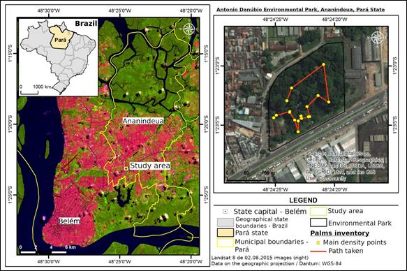 Antônio Danúbio Park is a conserved forest fragment located in Belém Metropolitan Region, Pará State. It presents great native flora species diversity, mainly palm trees (BASTOS, 2014). The park covers territorial space of 3,544 hectares and perimeter of 806.83 m (ANANINDEUA, 2011). Areas surrounding the park and overall areas around the city, are quite anthropic, but they still conserve vegetal formations (spots of dry land and lowland forests) mainly separated by urban constructions (ANANINDEUA, 2013). For two decades now, the park has been seen as a place for public leisure, since it is often visited by local residents. Among all aims of having the park in the region, one finds the maintenance of the local and regional ecosystem. It is important noticing that the park is available for community cultural, educational and leisure activities that do not pose risk to the environment (BASTOS, 2014). According to Alcântara & Vazquez (2016), a county that provides its population with high-quality public spaces allows it to have a healthy environment to live in.