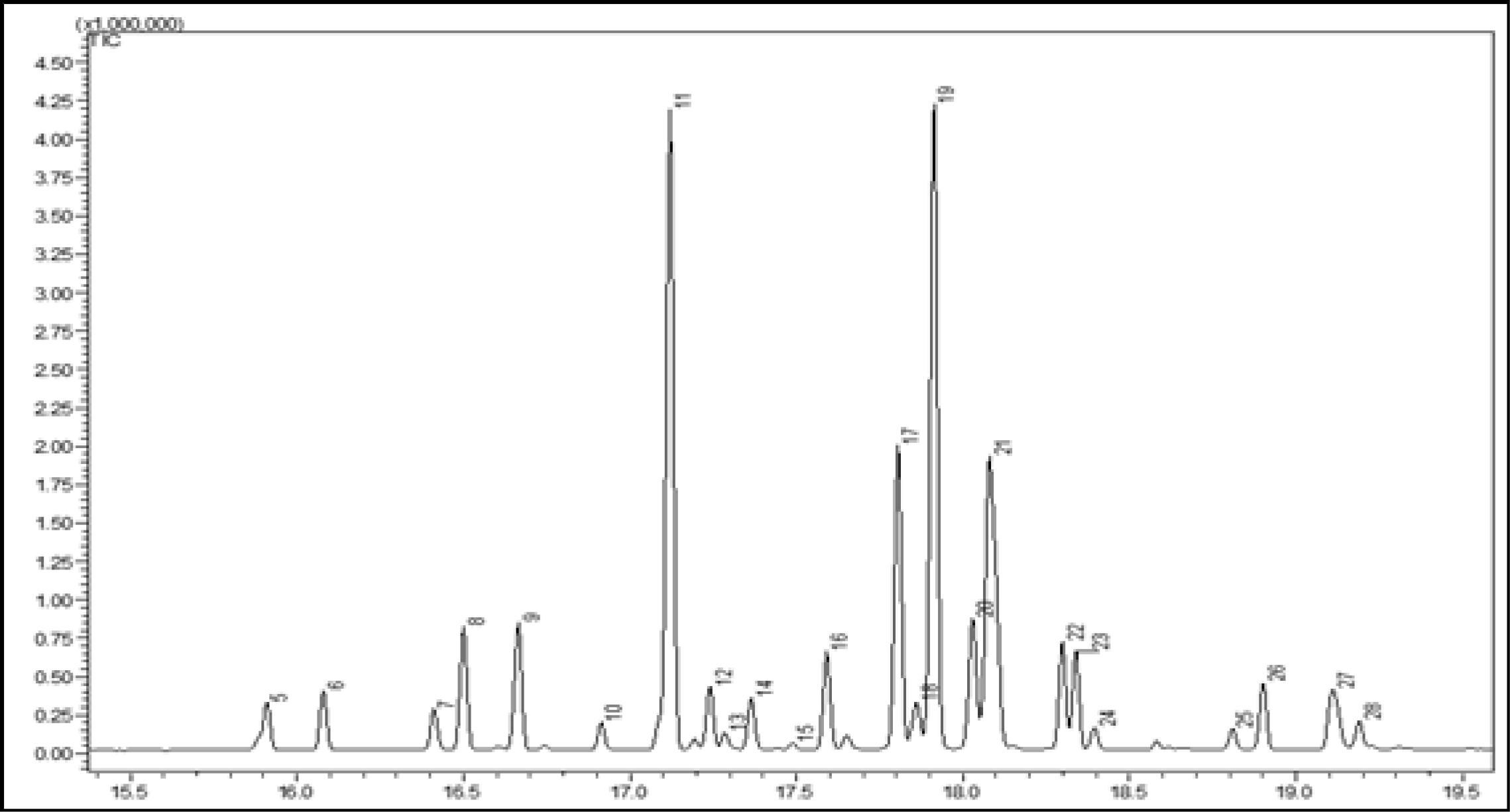 1.0 mg of the sample was dissolved in 1000 μL of dichloromethane (purity 99.9%). The conditions of analysis validated were as follows: Method: Adams. M, m; Injected volume: 0.3 μL; Column : Capillary HP-5MS (5% diphenyl, 95% dimethyl polysiloxane ) (Equivalent DB-5MS or CP-Sil 8CB LB/MS), in dimensions (30 m x 0.25 mm x 0.25 μm); Drag gas : He (99.9995); 1.0 mL.min-1; Gun: 280 oC, Split mode (1:10); Oven: 40 oC (5.0 min.) up to 240 oC at a rate of 4 oC min-1, from 240 oC to 300 oC (7.5 min) at a rate of 8 oC.min-1 ); tT = 60.0 min; Detector : EM; EI (70 eV); Scan mode (0.5 sec scan-1); Mass range: 40 - 500 daltons (one); Line transfer: 280 oC.; Filament: off 0.0 to 4.0 min; Linear quadrupole mass spectrometer. The AMDIS (Automated Mass spectral Deconvolution Mass & Identification System) program was used to identify the compounds in the sample.